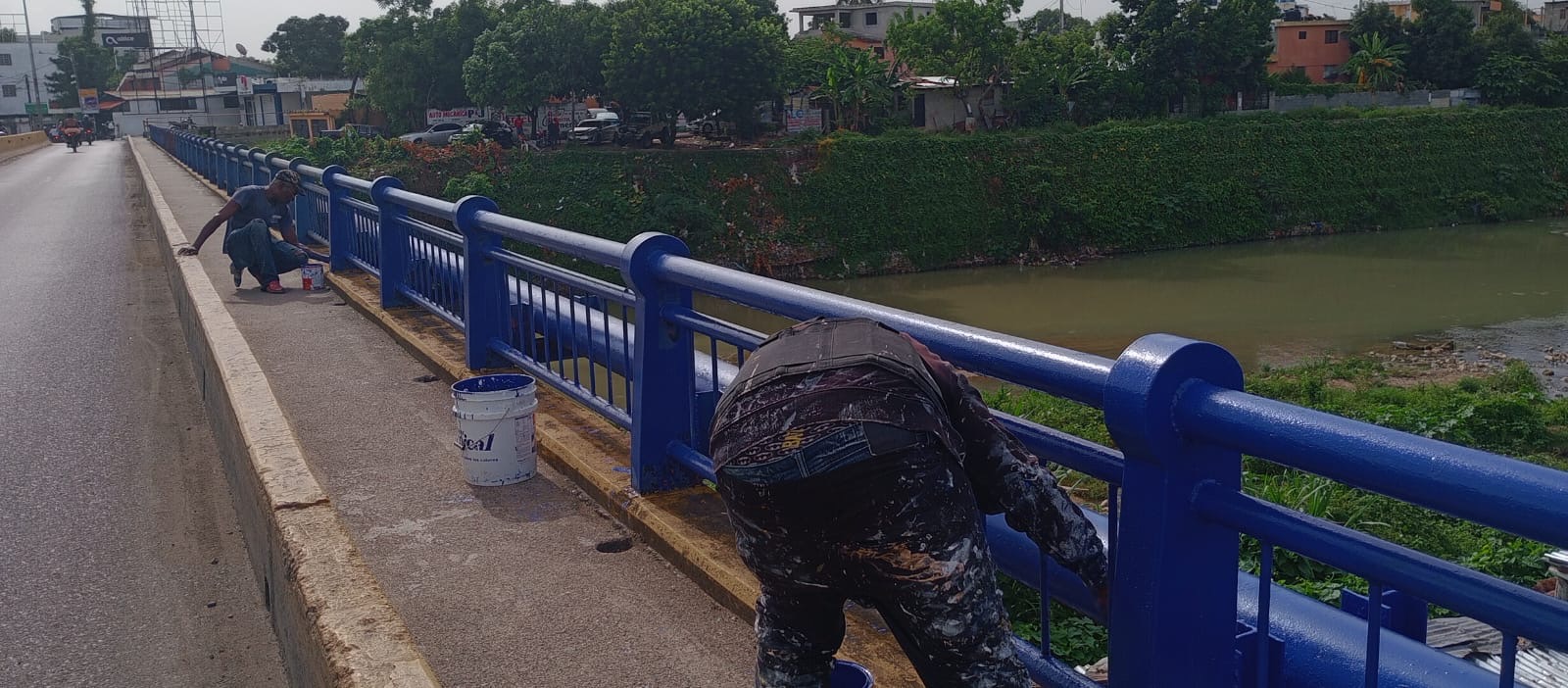 SAN CRISTÓBAL.- El Ayuntamiento de San Cristóbal (ASC) pinta las estructuras metálicas en el puente sobre el río Nigua, en la antigua carretera Sánchez en Madre Vieja Sur.