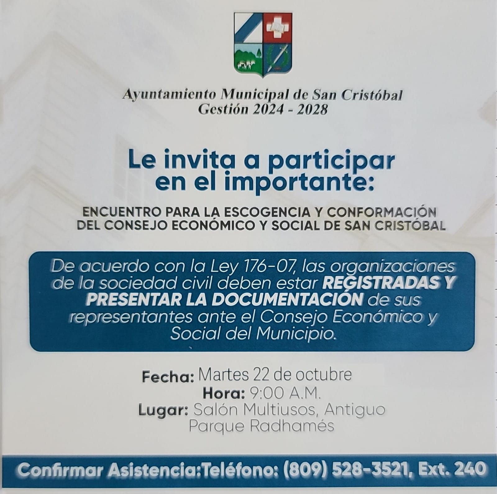 El Ayuntamiento Municipal de San Cristóbal les invita a participar en el encuentro para la escogencia y conformación del Concejo Económico y Social.