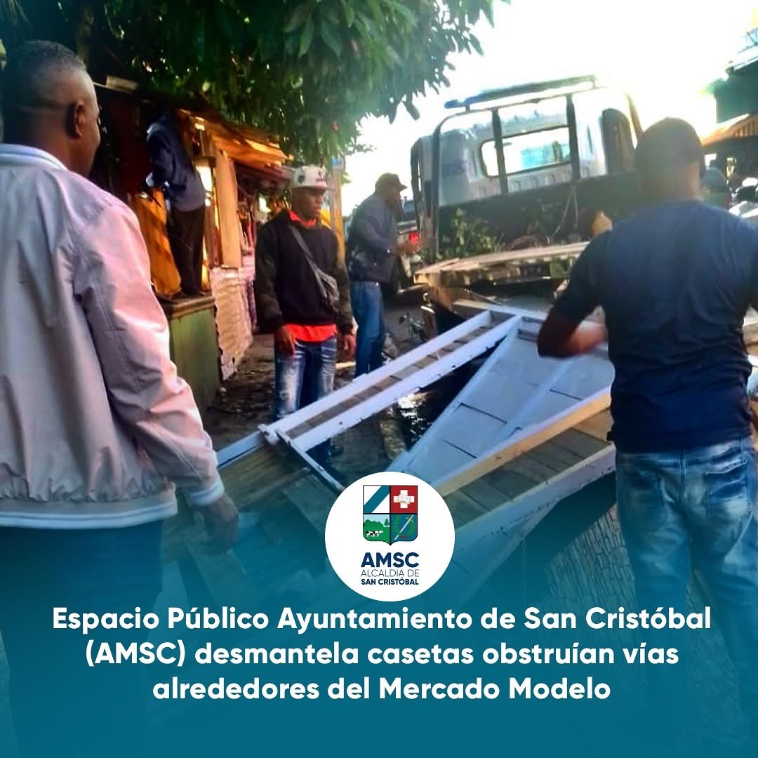 San Cristóbal.-Porque sus propietarios se negaban a retirarlas, brigadas del Departamento de Espacio Público desmantelaron varias casetas que obstruían el paso de peatones por los entornos del Mercado Modelo de esta ciudad.