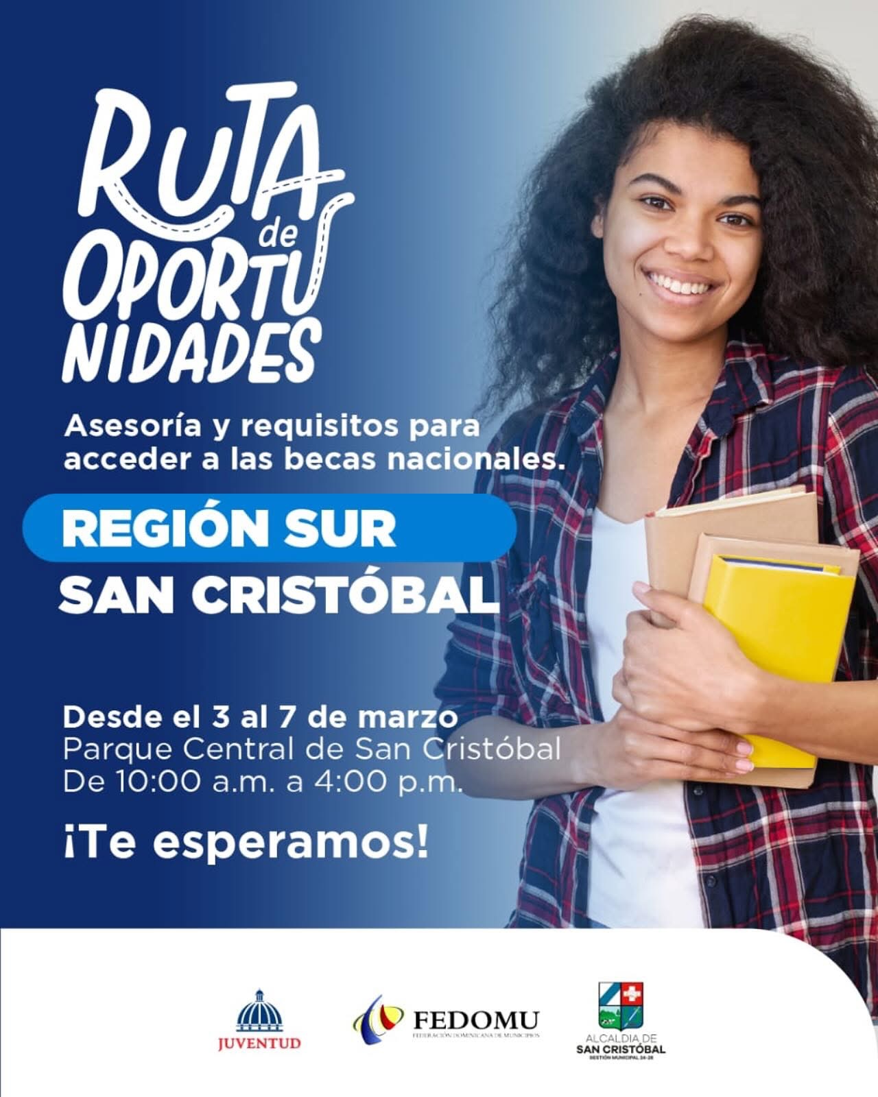Si sueñas con una beca para impulsar tu futuro, esta es tu oportunidad. Del 3 al 7, de 10:00 a. m. a 4:00 p. m., en el Parque Central de San Cristóbal brindando asesoría y los requisitos para acceder a becas nacionales.